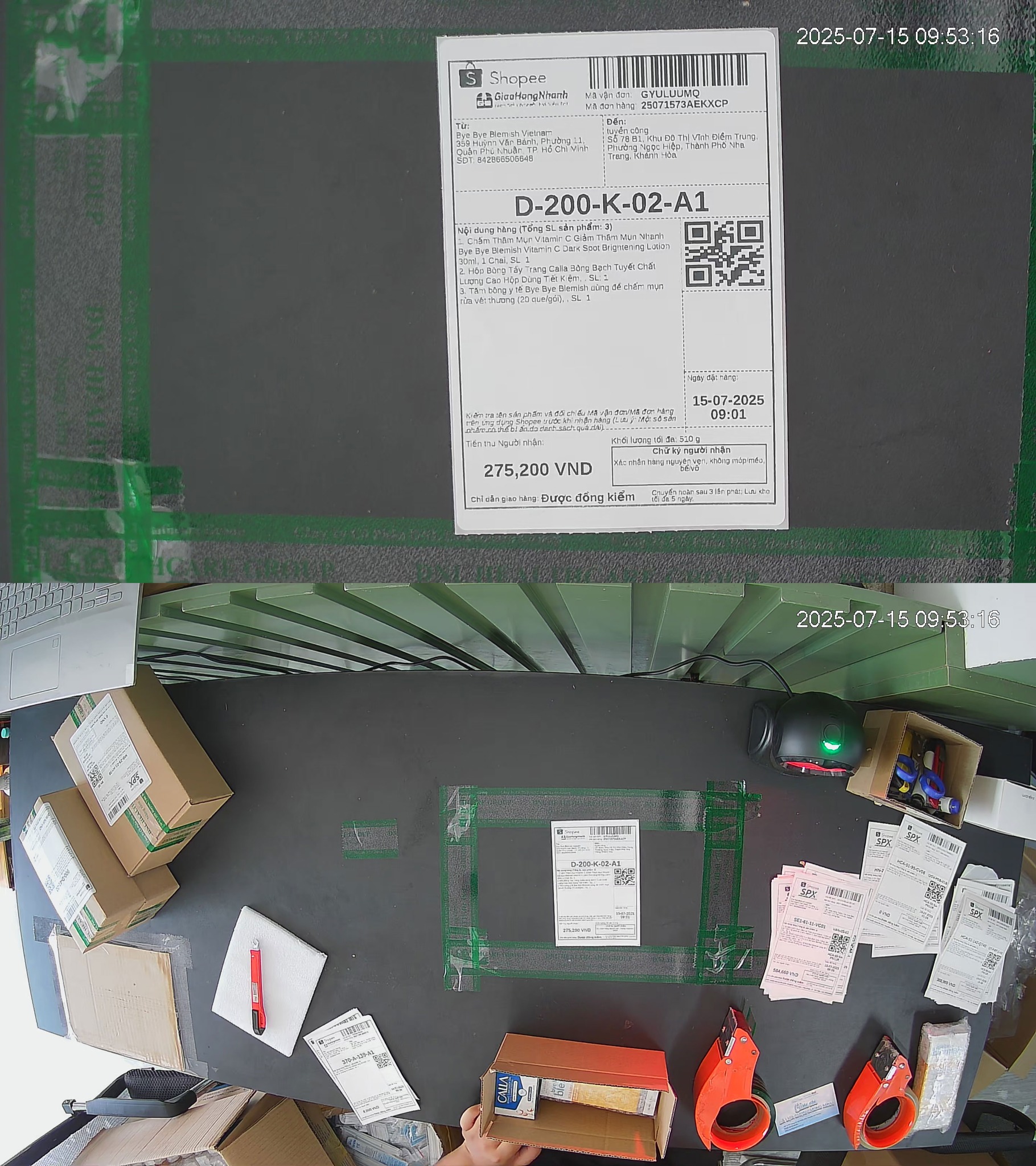 Mỗi đơn hàng đi qua bàn đóng gói đều được camera ghi lại chi tiết, kể cả mã vận đơn. Điều này giúp nhân viên làm việc cẩn thận, tránh nhầm lẫn sản phẩm hoặc dán sai mã.